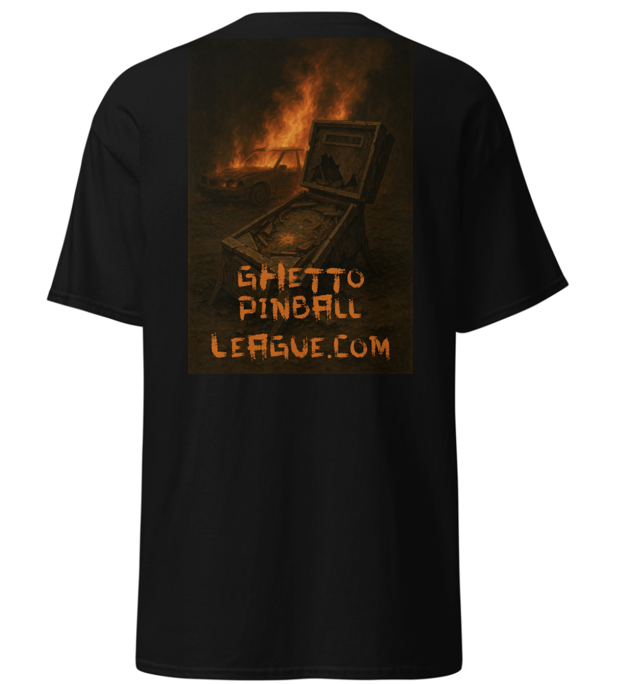 On the Back the larger GPL artwork with GhettoPinballLeague.com in a rustic/rusted font.